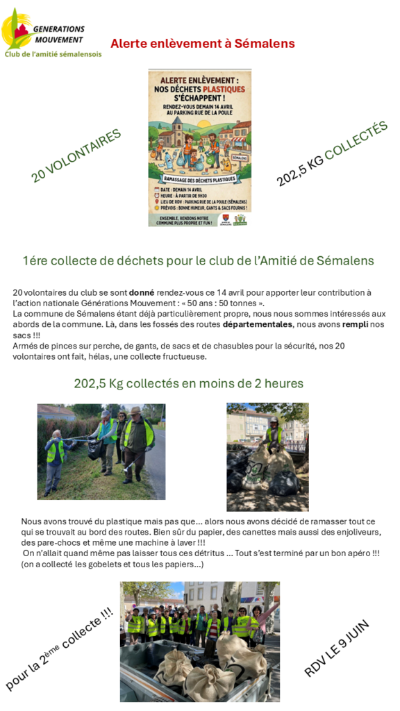 Pour le cinquantenaire de notre fédération nationale, le Club de l’Amitié de Sémalens a décidé de participer à l’action nationale de ramassage des déchets :