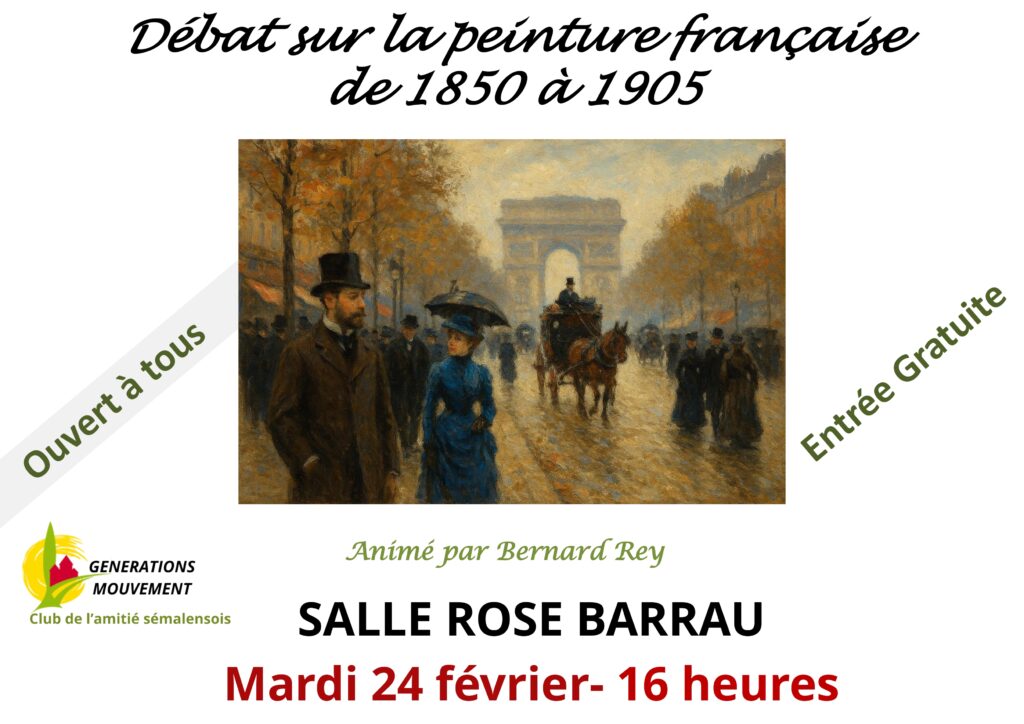 Nous avons décidé d’ouvrir ce service à tout le monde, les adhérents du Club seront prioritaires. La prochaine session aura lieu le mardi 24 février à 14h30 salle Rose Barrau, elle sera suivie à 16h d’un échange sur la peinture française de 1850 à 1905 mené par Bernard qui nous donnera les clés de compréhension de l’art de la peinture.